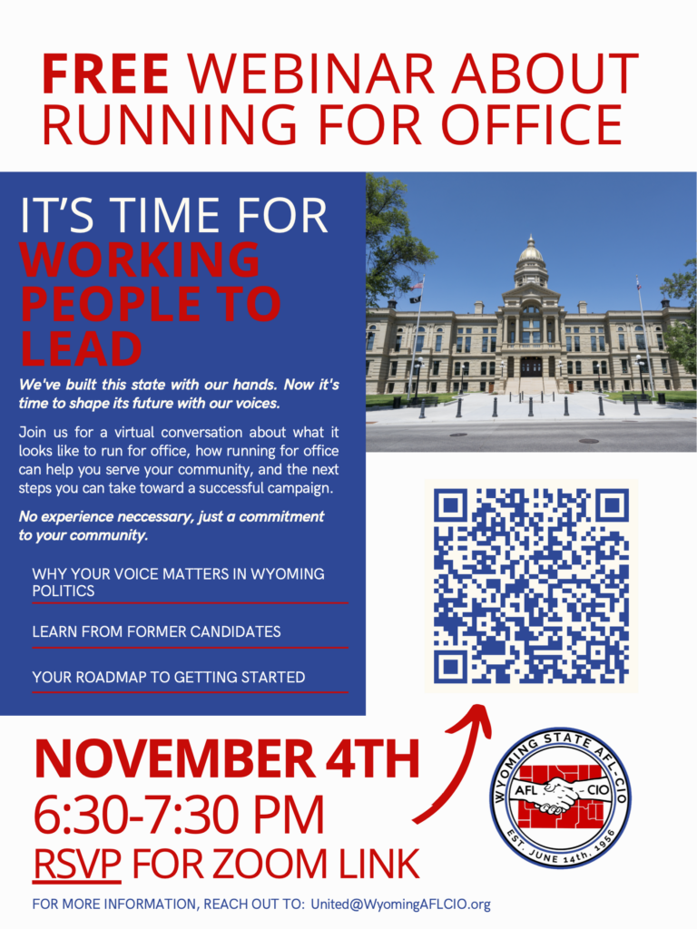 The Wyoming State AFL-CIO is conducting a webinar on November 4th, 2025. From the flier, shared below in a PNG document: